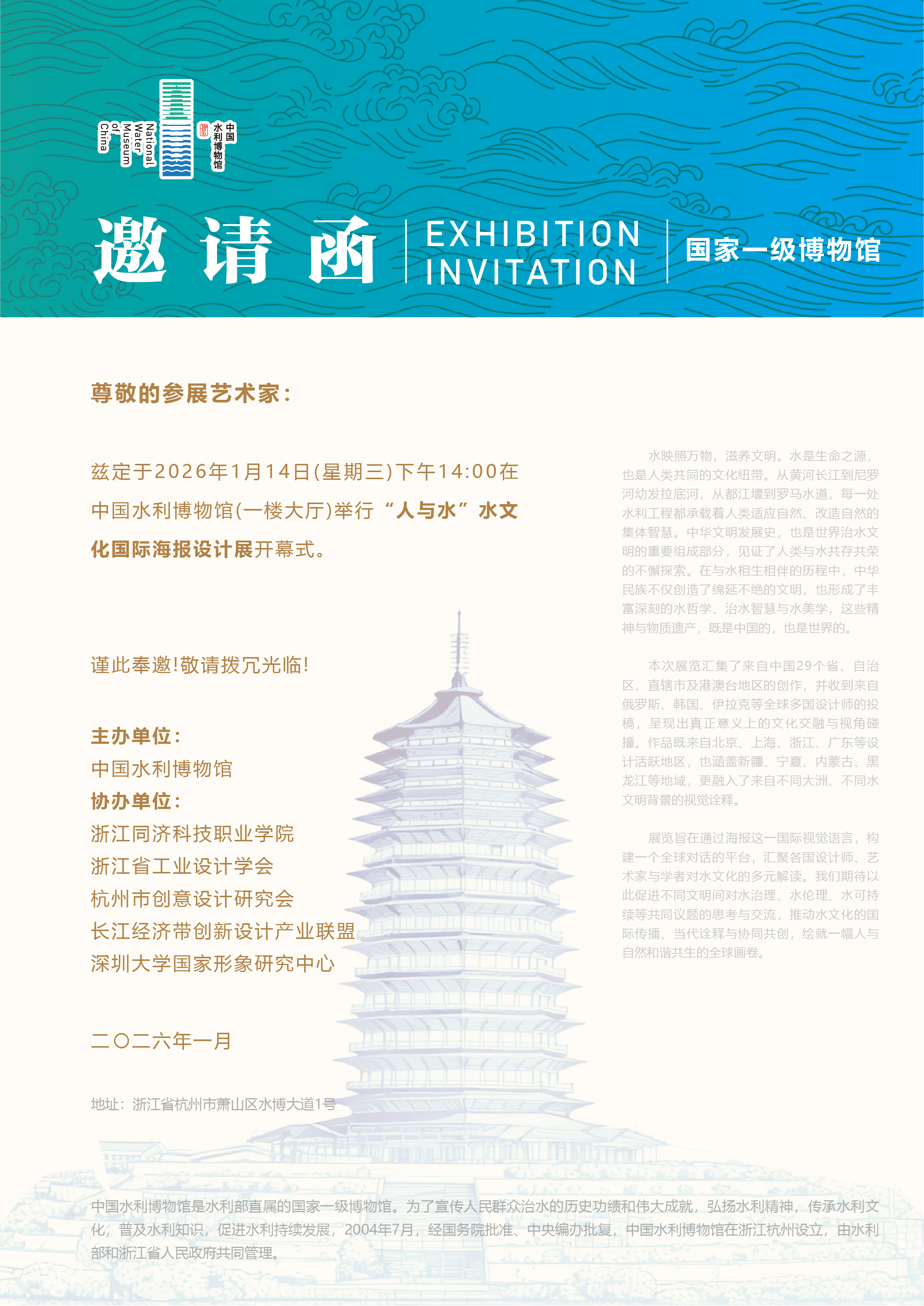 本展览兹定于2026年1月14日(星期三)下午14:00在中国水利博物馆(一楼大厅)举行“人与水”水文化国际海报设计展开幕式。谨此奉邀!敬请拨冗光临!